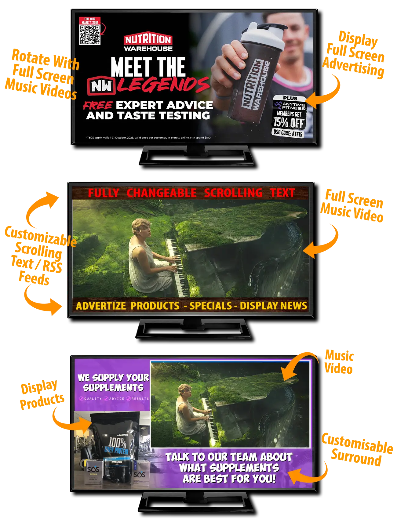 Your members are already in the mindset to invest in their health — make sure they know exactly what you offer. With integrated digital signage throughout your facility, you can highlight your full range of supplements, apparel, equipment, recovery tools, and member‑only upgrades. This not only boosts awareness but creates a consistent, reliable revenue stream that supports your bottom line.